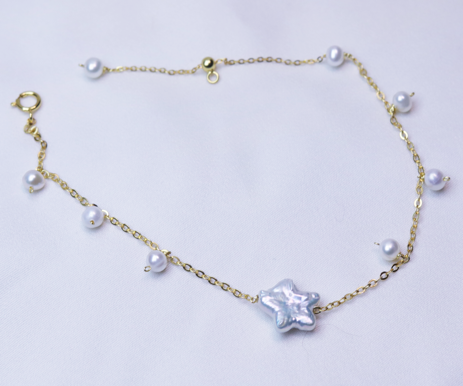 Delicate, luminous, and playfully elegant. This bracelet features a sculpted baroque star-shaped pearl at the centre, paired with dainty freshwater pearls along a sleek S925 sterling silver gold-plated chain. Light, feminine, and full of soft shimmer, it’s the perfect everyday piece for those who love subtle charm with a touch of individuality.
